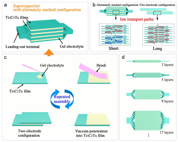 图1. 交替堆叠电极构型的超级电容器的组装及结构示意图。