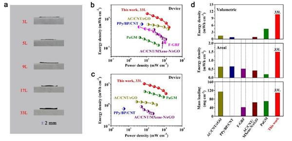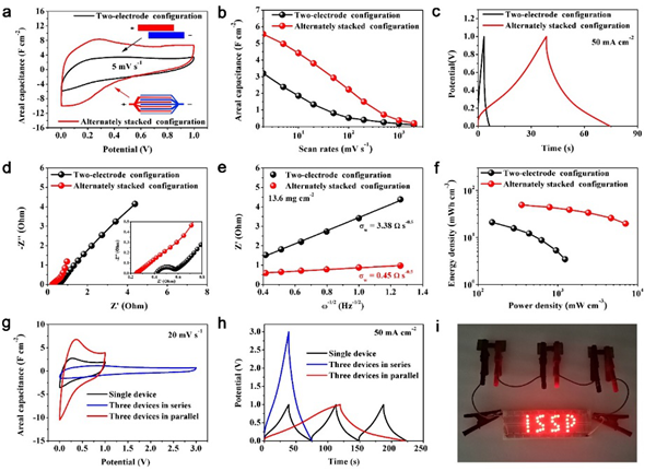 图3. 交替堆叠电极构型的超级电容器基于整个器件的电化学性能。