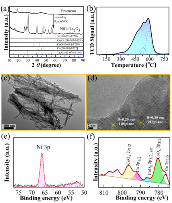 基于此,课题组通过构筑负载型非贵金属催化剂,以醛和硝基化合物为反应底物,利用加氢和碳氮耦合反应,高选择性地生成亚胺或仲胺。分析反应体系(加氢-耦合反应合成亚胺,加氢-耦合-加氢反应合成仲胺)后发现,所合成的催化剂具备双功能催化活性、且加氢性能可调的条件是实现选择性的关键因素。Ni基催化剂具有优异的加氢性能,通过Ni与还原性载体LaOx间的相互作用可以调节其加氢性能。而随着金属Co的引入,可以在金属与载体相互作用的同时形成金属间的相互作用,进一步调节活性金属的催化活性和稳定性,获得适宜的加氢性能。由于这两种相互作用力的协同作用,所合成的NiCo双金属催化剂可以通过简单的调节反应条件实现亚胺和仲胺的选择性合成。另外,结合结构-性能实验、反应动力学及理论计算结果,阐明了Ni、Co双金属间及与载体间的相互作用力在加氢-耦合反应体系中的重要作用。该双金属催化剂具有优异的加氢选择性、温和的反应条件、良好的催化稳定性及反应体系可扩展性等优异特性,在选择性还原、耦合等反应体系中具有广泛的应用前景。