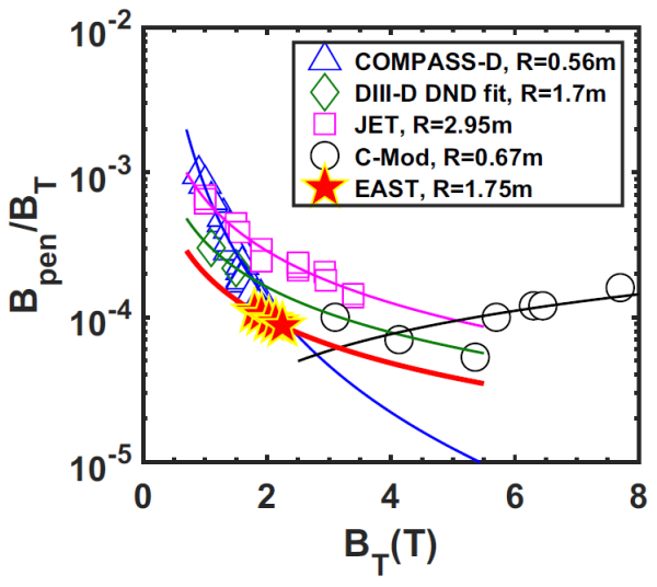 锁模诱发等离子体大破裂是未来磁约束聚变堆装置如ITER等能否高参数稳态运行面临的一个巨大挑战,如为了避免锁模,ITER专门设计了校正场线圈系统。近二十年来,国际上主要的托卡马克装置为此开展了大量的误差场锁模定标实验研究,而误差场锁模实验定标与理论模型仍然差距巨大且悬而未决。为此,自2014年EAST上共振磁扰动系统建立以来,课题组系统开展了误差场锁模实验研究,并取得了一系列新进展。