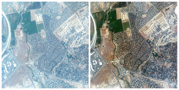加州真彩色影像大气校正前(左图)、后(右图)对比
