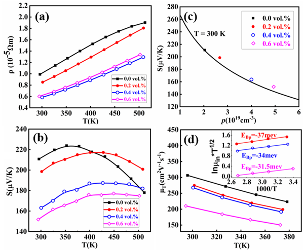 图2. 电阻率 ρ (a), 热电势 S (b), 迁移率μT (d) 随温度变化关系;(c)热电势随载流子浓度变化趋势。