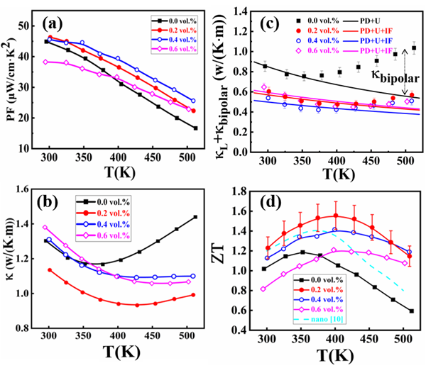 图3. 功率因子PF (a), 总热导率 κ (b), κL+κbipolar (c), (d) ZT随温度变化关系。