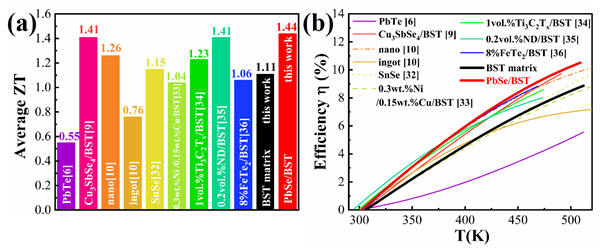 图4. (a) 0.2 vol. % PbSe/ BST复合样品和BST基体在300 -512 K的平均ZT, 以及其它典型热电材料的ZTave;(b) 0.2 vol.% PbSe/ BST复合样品和BST基体在300 -512 K的热电转化效率 η 以及其它典型热电材料的 η。