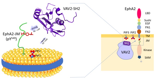 Vav2-SH2 蛋白与磷脂及EphA2-JM结合的示意图