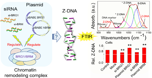 为了考察细胞中染色体重塑引起的DNA构象变化,研究人员利用红外光谱技术对细胞光谱中与DNA相关的特征峰进行仔细观测与分析,发现通过调节染色质重塑复合物SWI / SNF中的催化亚基BRG1/BRM,可以诱导染色质重塑的发生,并由此诱发DNA的B-Z构象转变。红外光谱具有简便、快速、无损检测的特点,它可以对细胞中的生物大分子进行定性和定量分析。此前,黄青课题组应用红外光谱成功实现了Z-DNA的表征,发现组蛋白乙酰化可引起染色质中Z-DNA转变(Analytical Chemistry,2016, 88: 4179-4182)。在此次研究中,他们不仅利用红外光谱技术研究了ATP依赖型染色质重塑中的DNA构象转变,而且借助染色质免疫共沉淀技术,进一步验证了该染色质重塑中所发生的Z-DNA构象转变,这从另一方面也证明了红外光谱表征Z-DNA结果的可靠性。
