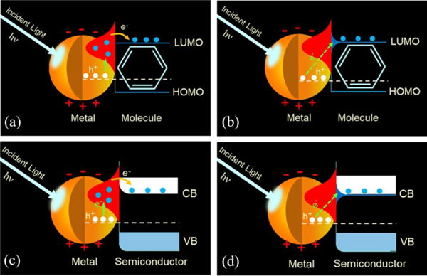 图2. 表面等离激元热电子在金属与表面吸附分子(a)(b)和半导体(c)(d)间不同转移机制。(a)、(c)表示间接转移机制;(b)、(d)表示直接转移机制。