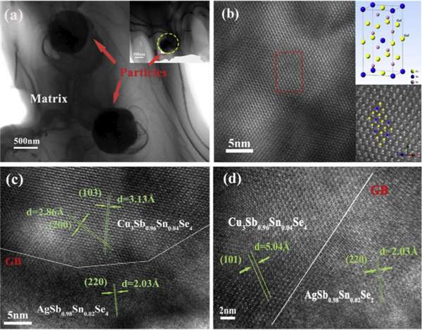 图1. (a) - (c) Cu3Sb0.96Sn0.04Se4/5 wt% AgSb0.98Sn0.02Se2的低放大率TEM图像;(d) Cu3Sb0.96Sn0.04Se4矩阵和结构模型的HRTEM图像(类似于Cu3SbSe4 [021])。
