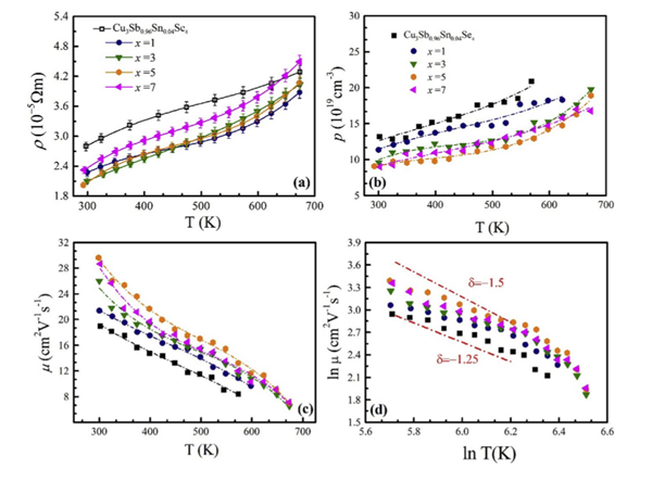 图2. Cu3Sb0.96Sn0.04Se4和Cu3Sb0.96Sn0.04Se4/x wt%AgSb0.98Sn0.02Se2 (x = 1,3,5,7)复合样品在温度300-673 K范围内的电学性能:(a)电阻率(折射率);(b) 载流子浓度;(c) 迁移率;(d)迁移率的对数随温度变化曲线图。