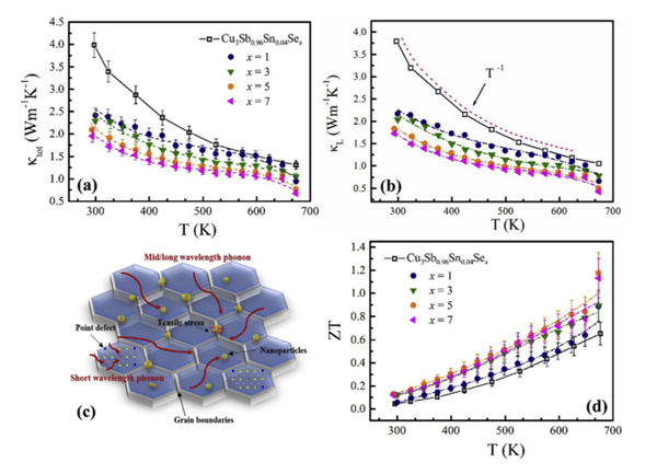 近年来,Cu3SbSe4由于其组成元素廉价、本征晶格热导率低且电输运性质优异,引起了人们的极大关注。但大多数研究都集中在改善Cu3SbSe4基材料的热电性能上,并没有有效的方法可以在实现功率因子显著提高的同时降低导热系数。在该研究中,科研人员将AgSb0.98Sn0.02Se2粒子引入Cu3Sb0.96Sn0.04Se4基体中,通过研磨和电火花等离子烧结技术形成Cu3Sb0.96Sn0.04Se4/x wt%AgSb0.98Sn0.02Se2 (x = 0,1,3,5,7)纳米复合材料。研究发现,由于导热系数的降低和载流子迁移率的增强,Cu3Sb0.96Sn0.04Se4/5wt%AgSb0.98Sn0.02Se2样品的ZT值达到了1.17;热导率降低是由多尺度大小的第二相AgSb0.98Sn0.02Se2增强声子散射引起的;界面缺陷导致的新受主能级会引起迁移率增加和载流子浓度降低,从而进一步实现了功率因子的增加。该研究结果表明,在Cu3Sb0.96Sn0.04Se4基体中嵌入AgSb0.98Sn0.02Se2颗粒能够显著提高其热电性能。