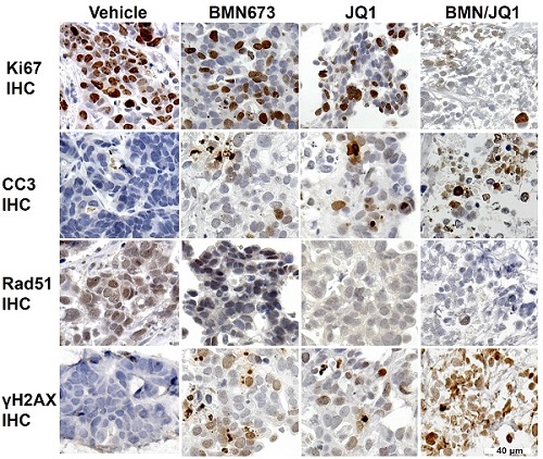 体外细胞和体内动物实验研究都说明了JQ1和BMN673联合使用均协同抑制小细胞肺癌的增殖和生长。该研究证明PARP抑制剂和表观遗传抑制剂联用可以产生“合成致死”效应治疗小细胞肺癌。