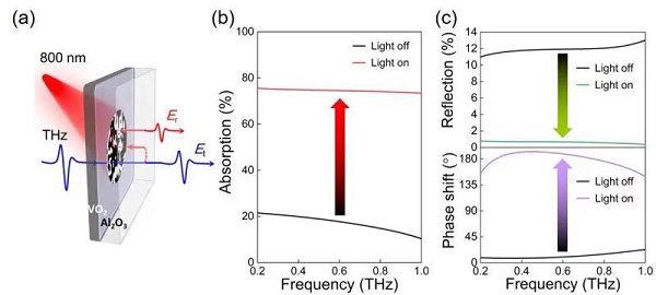 (a)研究团队选用强关联电子氧化物作为功能层,采用多层介电结构设计与光控方法; (b)通过光控的方法在多层器件中实现了大于74%的调制深度 ;(c)在特定激光能量条件下,可以实现宽带零反射与接近180°的太赫兹相移