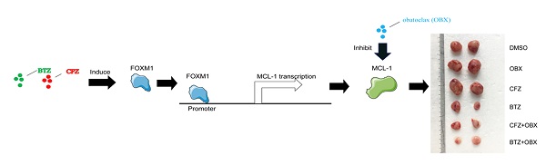 蛋白酶体抑制剂硼替佐米(bortezomib, BTZ)和卡非佐米(carfilzomib, CFZ)已经临床应用于治疗血液肿瘤,但是蛋白酶体抑制剂在小细胞肺癌中由于耐药以致临床实验效果不太理想。为了研究蛋白酶体抑制剂硼替佐米和卡非佐米治疗小细胞肺癌时产生耐药性的分子机制,林文楚研究员团队和复旦大学的丁琛教授团队合作,通过高通量蛋白质组学的手段筛选鉴定, 发现蛋白酶体抑制剂处理小细胞肺癌细胞后会显著影响肿瘤细胞依赖的关键蛋白-MCL-1的积累,进一步的分子机理研究显示蛋白酶体抑制剂是通过抑制转录因子-FOXM1的降解,进而促进MCL-1在转录水平的增加和对药物的耐受。体内细胞实验和体外动物实验的结果显示使用MCL-1抑制剂obatoclax靶向抑制MCL-1的同时联合蛋白酶体抑制剂硼替佐米或卡非佐米协同增强蛋白酶体抑制剂杀伤/抑制小细胞肺癌细胞的能力。该结果表明,在治疗小细胞肺癌时同时靶标MCL-1可能是一个有效的提高硼替佐米和卡非佐米临床治疗效果的方式。