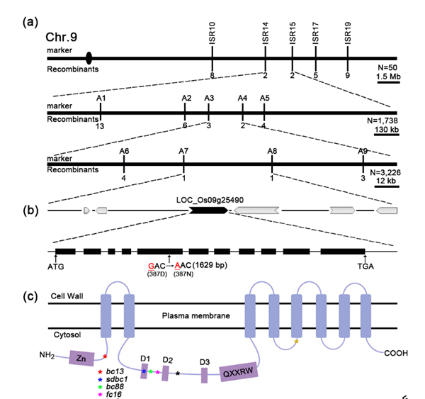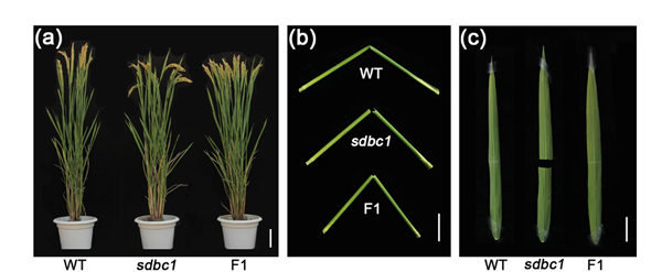 CEF1基因解决了常规稻秸秆还田难题,但是对于我国主推的杂交水稻来说,由于cef1的隐性遗传特性难以直接应用。杂交稻生物量大、应用面积广,因此产生的秸秆数量更多,如何处理也面临极大的挑战。叶亚峰博士利用重离子诱变获得了一个半显性脆秆突变体Sdbc1,通过图位克隆发现SDBC1基因编码的是一个纤维素合成酶催化亚基OsCESA9,在第387位保守的天冬氨酸(D)位点突变成了天冬酰胺(N)。