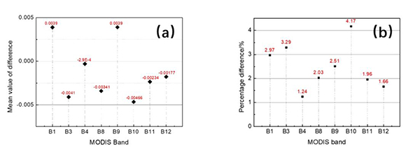在进行辐射标准传递应用前,需要对SCS星上定标精度进行验证,与业内公认高精度的TERRA MODIS(中分辨率成像光谱仪)进行交叉定标比对。通过卫星“两行报”对其轨道进行预测,选择对海洋、森林和沙漠等不同场景的交叉同目标观测数据,对SCS辐射定标精度进行比对验证。通过两颗遥感器对相同地物目标反演得到的等效表观反射率绝对差值最大为0.0039,相对偏差最大为4.17%。