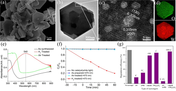 图1. (a)-(d)制备的WO3-x纳米片扫描电镜、透射电镜和能谱表征结果;(e) WO3-x纳米片及其对照样品的光学吸收谱;(f) WO3-x纳米片对甲基橙的光催化降解;(g)不同捕获剂对催化效率的影响。
