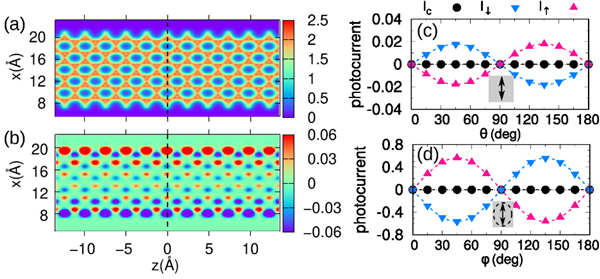 图2. 锯齿形石墨烯纳米带的(a)电荷密度和(b)自旋密度分布图;(c)线偏振光以及(d)椭圆偏振光照射下,自旋分辨光电流和和总的电荷光电流随偏振角以及螺旋角的变化。