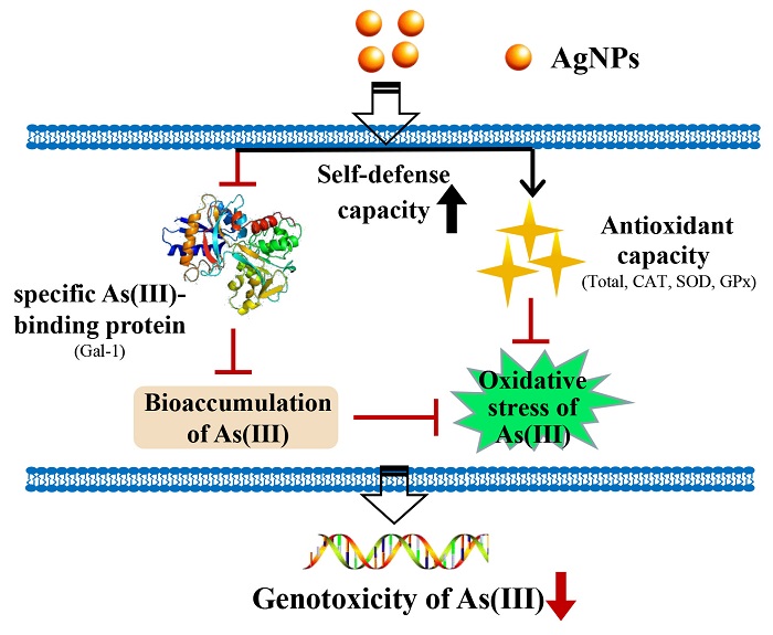 鉴于纳米材料对生物体自我防御系统的刺激作用,增强生物体的自我防御能力可能为生物体主动抵抗砷诱导的毒性作用开辟新的途径。在本研究中,研究人员以在生物医学领域应用最为广泛的纳米材料-纳米银与砷为研究对象,通过低剂量无毒的纳米银对哺乳动物细胞的预处理,发现纳米银可显著抑制砷诱导的磷酸化组蛋白H2AX(γ-H2AX,核DNA双链断裂的标志物)的产生和CD59基因突变频率。纳米银一方面通过抑制砷特异性结合蛋白(Gal-1)的表达,降低砷在细胞内的生物累积,另一方面通过上调细胞内的抗氧化酶活性,最终减少了胞内氧化应激的产生。该研究结果为纳米银可作为一种新的潜在制剂在保护生物体免受砷诱导的遗传毒性的应用上提供了新线索。