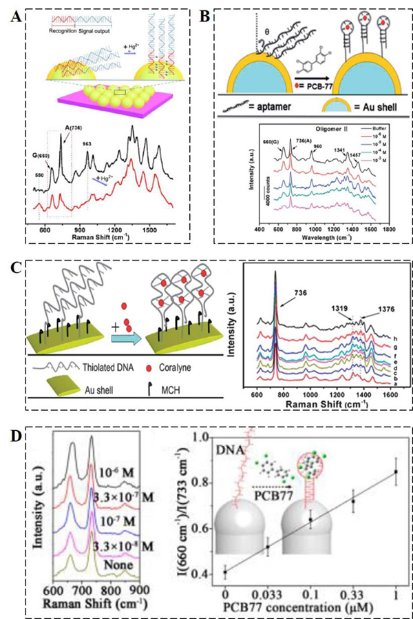 之前,黄青课题组在基于适配体的SERS检测技术和方法方面也做了一系列研究工作。例如,他们利用适配体功能化的银纳米棒阵列和金壳纳米颗粒,制备成高灵敏和高特异性的SERS基底,可以对药物和环境污染物进行特异性痕量分析。他们对用适配体-SERS方法检测柯喃因(一种肿瘤药物,Anal. Methods, DOI: 10.1039/c3ay40099a),对环境中的多氯联苯(Analyst, DOI: 10.1039/c4an00197d; ACS Appl. Mater. Interfaces DOI: 10.1021/acsami.5b12866)和汞离子(Sensors and Actuators B, DOI: 10.1016/j.snb.2017.11.110)进行快速痕量检测等。