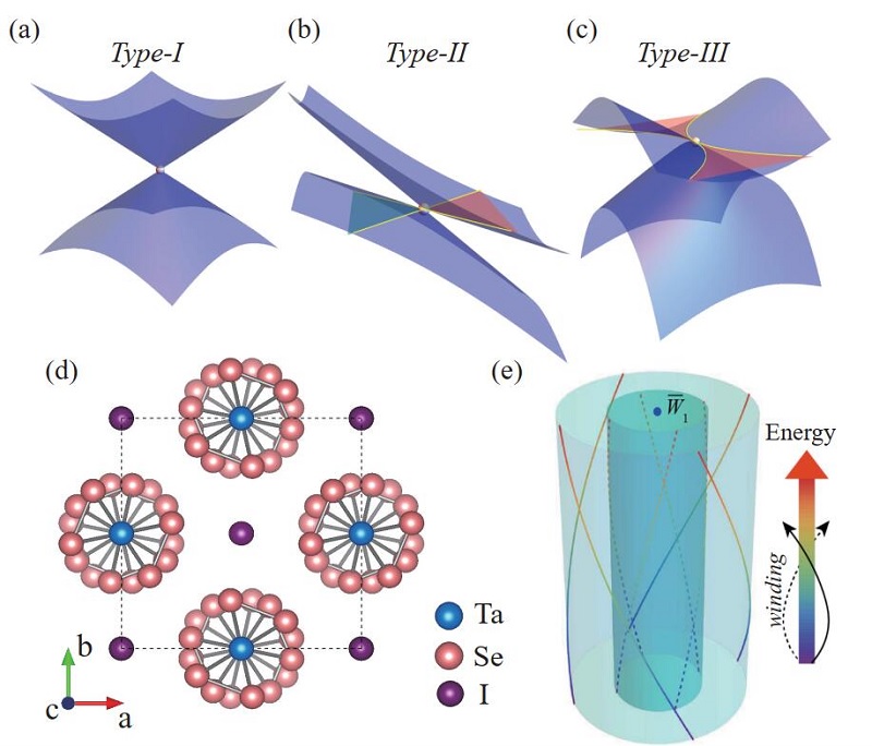 图1:三类外尔点的示意图:(a)第一类外尔半金属的点类型费米面;(b)第二类外尔半金属的电子-空穴口袋型费米面;(c)第三类外尔半金属的电子(空穴)-电子(空穴)口袋类型费米面;(d)Ta2Se8I的晶体结构;(e)001面上四重螺旋表面态。
