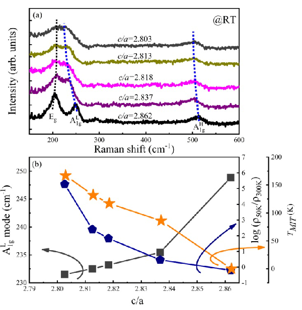 为了解决上述问题,科研人员在V2O3薄膜生长过程中将衬底温度作为唯一变化的调控参数,利用V2O3和Al2O3之间的晶格/热膨胀系数失配,在V2O3薄膜中实现了应力和三角畸变的大范围连续调节。在V2O3薄膜中通过面内拉伸应力增强三角畸变将PM相转变为PI相,电输运性质和拉曼光谱结果表明V2O3薄膜中应力与单晶中Cr掺杂对PM-PI相变具有相同的作用。这为澄清V2O3中PM-PI相变机理争议提供了关键的实验证据,直接揭示了三角畸变在PM-PI相变中的重要作用,对比实验表明Cr掺杂导致的局域结构畸变/无序只是起到了增大PM相和PI相电阻率的作用。通过拉曼光谱的研究还发现V2O3中PM相的轨道占据态随三角畸变发生显著变化并且直接决定了PM-AFI相变特性,从而改变了之前关于V2O3的PM相具有相同轨道占据态的传统观点,揭示了V2O3薄膜中的应力具有与单晶中的掺杂和静水压截然不同的调控机理,这为认识和理解PM相及其PM-AFI相变机理提供了新的依据。