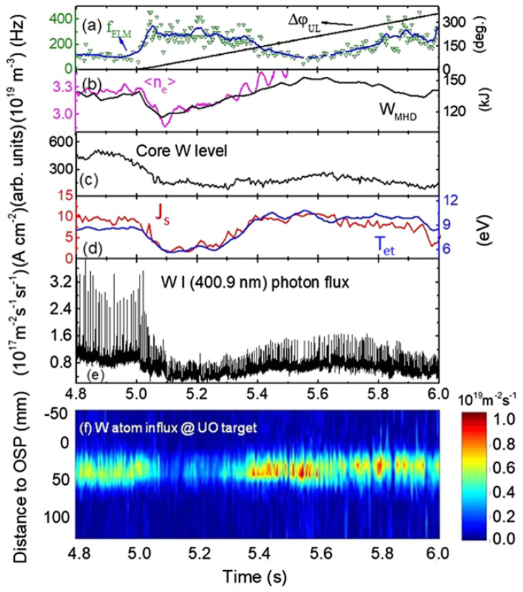 ELM是托卡马克高约束模式运行中常见的一种边界磁流体不稳定性。ELM的爆发不仅会给钨偏滤器靶板带来周期性瞬态的强热流冲击,其携带的高能量粒子流也会造成严重的靶板钨溅射,影响靶板的寿命,产生的钨杂质会污染芯部等离子体,降低等离子体约束性能,因此对ELM的有效控制是ITER和未来聚变堆研究面临的重大挑战之一。长期以来,ELM控制的研究主要是以降低到达偏滤器靶板的峰值热流和粒子流为目标,对热流粒子流如何导致靶板材料的溅射及其控制效果并不清楚,给钨杂质源的控制和将来聚变堆偏滤器寿命的评估带来了很大的不确定性。
