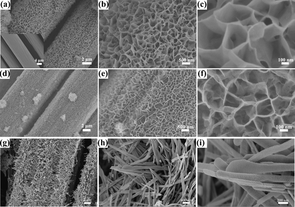 图2. (a-c) Co-Ni LDH/CC前驱体、(d-f) CoN- Ni3N /N-C/CC电极材料和(g-i)VN/CC电极材料的SEM图。