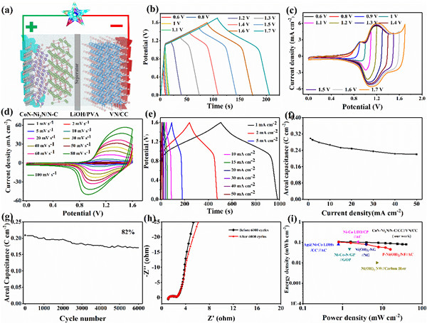 图3. (a) Co- Ni3N /N-C/CC//VN/CC FQAS的组装示意图;不同电压窗口下FQAS的(b) GCD和(c ) CV曲线;不同扫描速率和电流密度下FQAS的( d ) CV和( e ) GCD曲线,(f) FQAS的倍率性能;(g) FQAS在50 mA cm-2下充放电6000次的循环稳定性,(h) FQAS 6000次循环前后的EIS曲线;(i) FQAS装置的Ragone图。
