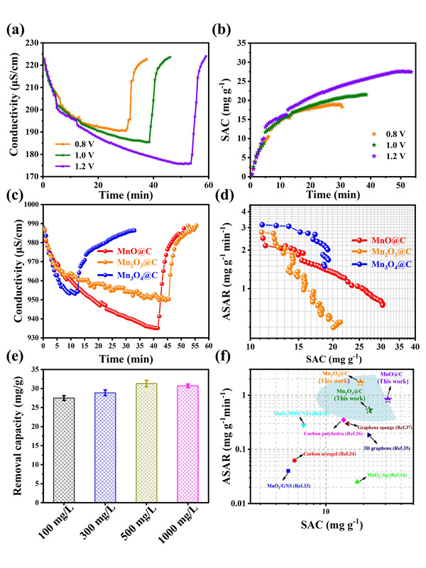 目前,淡水的日益枯竭和分布不均给社会经济发展带来了严峻的挑战。地球总表面积的71%被确定为海水,这是满足人类对饮用水需求的重要、潜在未开发水源,因此海水淡化被认为是一项可以解决淡水短缺问题的具有前景的工程。反渗透和热蒸馏是处理高盐浓度的海水或咸水广泛采用的技术,但这种方法在盐浓度较低的情况下能耗高且成本高。作为一种替代方法,电容去离子技术(CDI)可以通过双电层电吸附或赝电容反应去除离子,使高盐浓度的水脱盐。其中,高价态MnO2(IV)作为CDI中优异的法拉第电极被大量研究,尤其对MnO2不同晶型所表现的脱盐性能差异进行了深入的机理分析,但关于低价锰氧化物的研究鲜有报道。这种不同Mn价态所赋予的电容脱盐性能是否存在差异以及其内在机制值得进一步探讨。