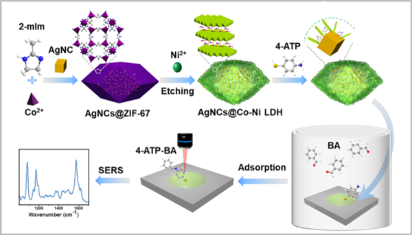 图1. AgNCs@Co-Ni LDH合成路线及苯甲醛检测过程示意图