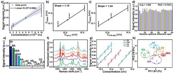 图3.基于AgNCs@Co-Ni LDH的SERS传感器的灵敏度、准确度、重复性及选择性(SA:水杨醛,EBA: 4-乙基苯甲醛,GA:戊二醛,HA:己醛,ET:乙醇,AC:丙酮,HE:正己烷,EA:乙酸乙酯,AA:乙酸,TO:甲苯。)