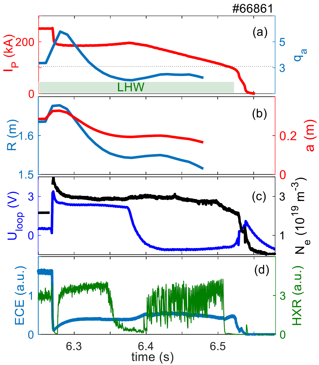 在逃逸电子方面,课题组系统研究了EAST装置破裂期间逃逸电子的产生和损失过程(图2),指出了低杂波共振加热产生的超热电子对逃逸种子的贡献,分析了磁流体不稳定性等对逃逸电子损失的影响。在放电平台期间发现了两种逃逸电子产生机制的分叉现象,直接证实了理论预测的逃逸电子产生存在两个阈值电场,即Dreicer电场和雪崩效应阈值电场,深化了对雪崩效应的认识。