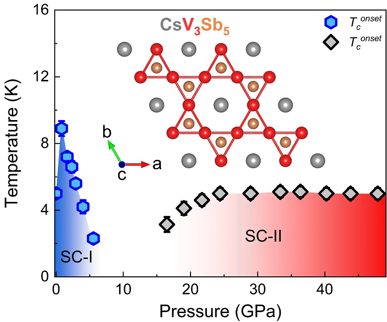 图1:CsV3Sb5温度-压力相图,中间插图为CsV3Sb5笼目晶格结构示意图