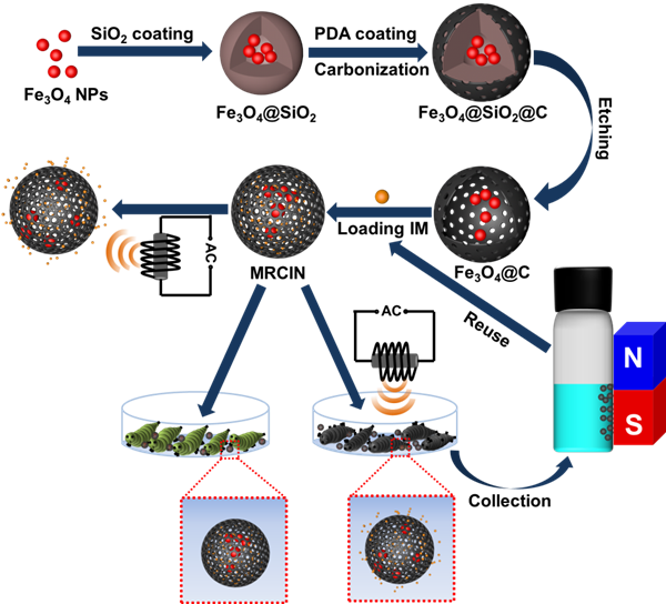 课题组构建了一种磁响应的核壳结构纳米农药控释平台,该平台拥有良好的磁响应能力,通过磁场的变化调控药物纳米颗粒的振动,进而实现农药分子的可控释放。该技术是一种绿色高效的农药控释体系,在提高农药利用率,控制农业面源污染,保护农业生态环境方面具有良好的应用前景。