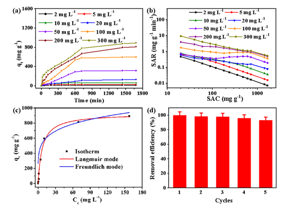 图2. (a)在1.2V电压下KHPC电极对TC的吸附动力学和(b) Kim-Yoon图(SAC vs. SAR);(c)KHPC电极材料对TC的吸附等温线; (d)初始浓度为10 mg L-1时,KHPC电极材料对TC的循环吸附性能。