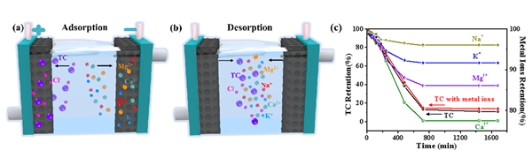 图3. (a) CDI过程中对TC和金属阳离子的吸附和(b)脱附示意图;(c)多种共存离子在CDI系统中同步去除性能。