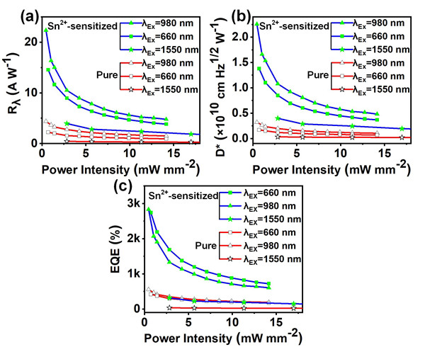 鉴于此,团队科研人员采用安全有效的掺杂敏化法,通过添加Sn2+对PbS进行敏化来提高其光电特性。研究结果表明,Sn2+的加入,延长了PbS薄膜形成的诱导期,提高了PbS结晶性,增大了晶粒尺寸,进而获得了高质量的Sn2+敏化的PbS薄膜(图1)。Sn2+敏化的PbS薄膜在可见光到近红外光的宽光谱范围内表现出优异的光电性能(图1)。在0.45 mW mm-2的980nm光照下,Sn2+敏化的PbS探测器光响应度达22.34 A W-1,探测率达2.26×1010 cm Hz1/2 W-1。与纯PbS相比,其光响应度提高了约5倍,探测率提升了约7倍(图2)。同时,Sn2+敏化使得其响应时间降低到微秒量级,仅是纯PbS薄膜探测器响应时间的十万分之一(图3a)。此外,该探测器对不同频率的脉冲光响应的稳定性高(图3b),在4 kHz高频脉冲光照射下,仍具有优异的稳定性和开关重复性能(图3c)。该工作表明Sn2+敏化的PbS薄膜可以被用作探测红外光的有效材料。