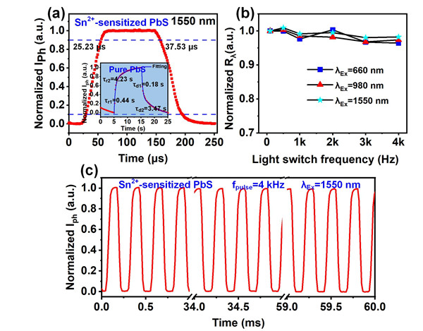 图3. 在波长为1550 nm的红外光照射下,探测器的光电特性:(a)响应速度;(b)Sn2+敏化的PbS薄膜探测器在不同频率的脉冲光作用下的响应稳定性;(c)Sn2+敏化的PbS薄膜探测器的4 kHz高频脉冲光下的归一化电流-时间曲线。