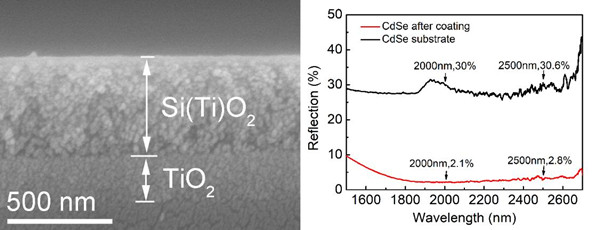 图1. CdSe基底上双层减反膜的SEM图像以及镀膜前后的反射光谱。