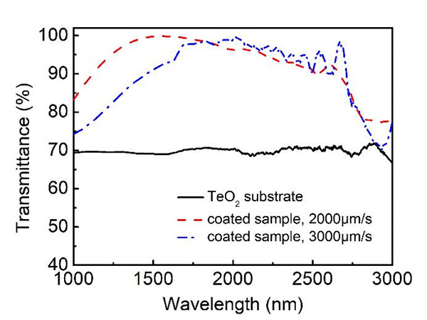 此外,研究人员以红外材料TeO2为基底,结合理论计算,通过调控溶胶成分制备了折射率优化的Si-Ti-PEG 600以及Si-Ti-PVA两种减反膜,并探讨了添加剂对膜层结构及热稳定的影响。结果表明,两种膜层均表现出高透过率,最佳透过率接近100%,减反峰值波长在1550nm-2460nm之间可调;膜层表面的低粗糙度有效抑制了表面反射。同时,膜层表现出良好的耐水性和耐高低温性,可耐受的光功率密度分别为3.53×106 W/cm2 和 3.40×106 W/cm2(2.79μm,3Hz)。