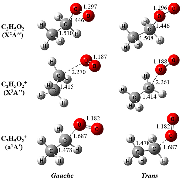 课题组唐小锋研究员与国家同步辐射实验室合作,以光子能量可调谐的同步辐射光作为电离源,结合自行研制的真空紫外光电离自由基质谱仪,开展了乙基过氧自由基(C2H5O2)的光电离质谱实验研究。实验中,采用流动管反应器产生乙基过氧自由基,并模拟其大气氧化过程,真空紫外光电离自由基质谱仪实时在线检测,获得了氧化反应中的乙基自由基(C2H5)、乙基过氧自由基、乙基氧自由基(C2H5O)等众多反应产物和中间体,并通过扫描同步辐射光子能量获得了各个反应产物的光电离效率谱。同时,通过开展高精度的量子化学理论计算,检测获得了乙基过氧自由基的两个转动构象体G-C2H5O2和T-C2H5O2。结果表明,G-C2H5O2构象体在光电离跃迁中起着主要作用,而T-C2H5O2构象体的光电离贡献较小。本研究为实时、在线检测不同种类过氧自由基及其同分异构体提供了重要数据和技术方法。