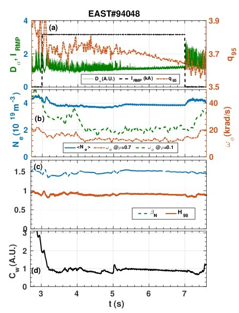 图1:EAST上实现边界局域模被n=4共振磁扰动抑制的参数区间