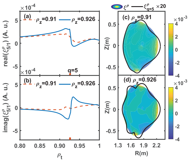 课题组深入研究了等离子体旋转对三维场的屏蔽效应,从等离子体响应角度加深了对ELM抑制的物理机理理解。利用MARS-F程序模拟发现在E×B旋转或电子垂直旋转零点在电阻奇异层内时,等离子体产生类剥离模响应;而当零点在奇异层外时,产生类扭曲模响应。EAST装置放电等离子体有理面上的旋转范围在±10krad/s内时有利于产生较强的等离子体响应。模拟结合实验验证了磁扰动在台基区顶部旋转接近零即可实现台基区顶部的扰动场渗透。相关结果由课题组博士生谢朋成发表于核聚变权威期刊Physics of Plasmas上(P. Xie et al 2021 Phys. Plasmas 28 092511)。