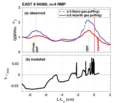 图3:ELM抑制期间高再循环对热负荷的有效降低以及与磁场连接深度模拟的对比