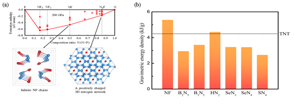 聚合氮是新型的高能密度材料,其含能密度是传统含能材料(如TNT)的5倍。通过压缩氮气得到聚合氮,合成压力较高,且高压合成的聚合氮样品在常压下难以保存,无法满足大规模材料制备需求。为了降低聚合氮合成压力并增强其稳定性,引入其它元素形成化合物被认为是一种有效方法。相关研究已经在金属-氮体系中发现了丰富的聚合氮形式,如N5环、N链等,其物理机制是通过氮接收电荷来形成稳定的聚合氮基团。但是氮原子通过失去电荷形成聚合氮却十分罕见。为了全面了解电荷转移效应,研究团队提出引入电负性较强的F原子,探索新型带正电聚合氮的物质存在形式。