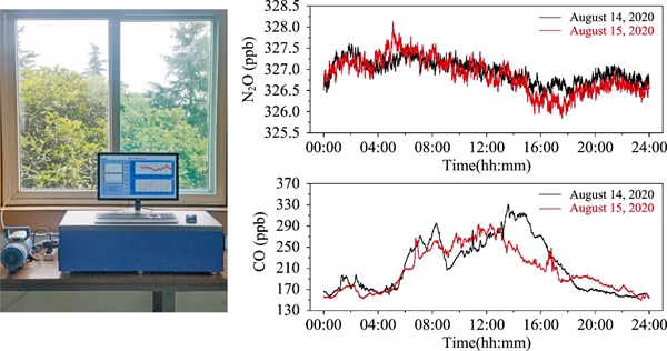 团队成员陈家金助研、邵李刚博士等人自主设计了改进怀特池,在34.5 cm的基长下获得了76 m的有效光程,结合使用中心波长4.5 μm的ICL激光器和射频噪声源,研制了大气温室气体N2O和CO高精度探测仪。通过进一步精确控制系统的温度和压力,在0.1 Hz下,连续24小时对N2O和CO的测量精度分别为65 ppt和133 ppt,每日漂移量均小于1.5 ppt。