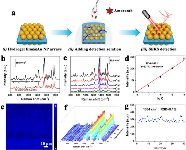 进一步分析100×100 μm2内水凝胶膜@密排金纳米颗粒阵列基底对苋菜红SERS检测光谱强度面分布图(图3e),图中的每个像素点的不同颜色代表测试位点测得SERS光谱1364 cm-1特征峰的强度大小,均匀的颜色分布表明该阵列基底具有良好的SERS信号均匀性,这归因于金纳米颗粒阵列大面积的均匀有序结构。此外,为了研究水凝胶膜@密排金纳米颗粒阵列用作SERS基底的信号可重复性,研究人员从5个不同批次的基底上各随机选择8个点,测试比较其SERS光谱,发现不同批次制得的阵列基底对探针分子拉曼信号的增强效果基本相同,信号强度的相对标准偏差(8.1%)小于10%(图3f-g),这表明水凝胶膜@密排金纳米颗粒阵列基底具有优异的SERS信号可再现性。