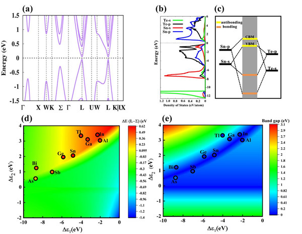 图1. (a) SnTe单晶的能带结构; (b) SnTe投影分波PDOS;(c) SnTe单晶中Sn和Te原子之间的相互作用示意图;(d) SnTe中轻(L)重(∑)带之间的能量差?E(L-∑)随?ε1和?ε2变化的等高线图;(e) SnTe的带隙Eg随?ε1和?ε2变化的等高线。