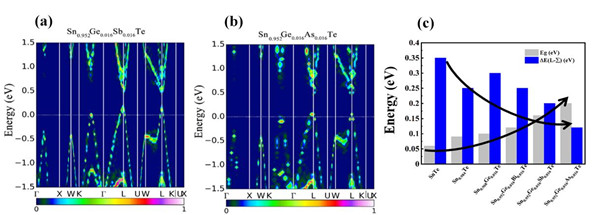 图2. DFT计算的(a) Sn0.952Ge0.016Sb0.016Te和(b) Sn0.952Ge0.016As0.016Te的能带结构图; (c) Eg和?E(L-∑)的变化趋势图。
