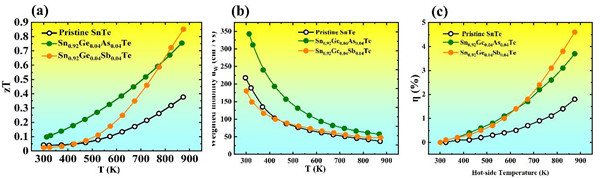 此外,通过进一步与实验研究组合作,合成制备出理论预测的样品(Sn0.92Ge0.04Sb0.04Te 和Sn0.92Ge0.04As0.04Te)并测量其热电性能,验证了理论预测的结果:(1)As和Sb掺杂有助于SnTe 的Seebeck系数提升;(2) As原子掺杂引起的能带简并效应(图2c)提高了其Seebeck系数和功率因子 PF,进一步提升了热电优值ZT (图3a)。权重迁移率(weighted mobility,图3b)和转化效率(图3c)的计算结果均表明 Ge-As 共掺杂 SnTe 样品(Sn0.92Ge0.04As0.04Te)具有较高的电学性质。本工作为通过缺陷工程和能带工程设计与寻找提高SnTe热电性能的高效掺杂元素提供了指导思路。